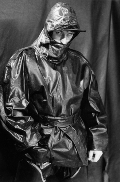 diving dry-suit, bike waterproofs and a black oilskin naval Foul Weather