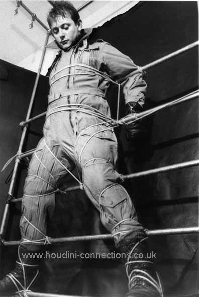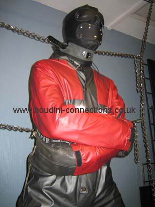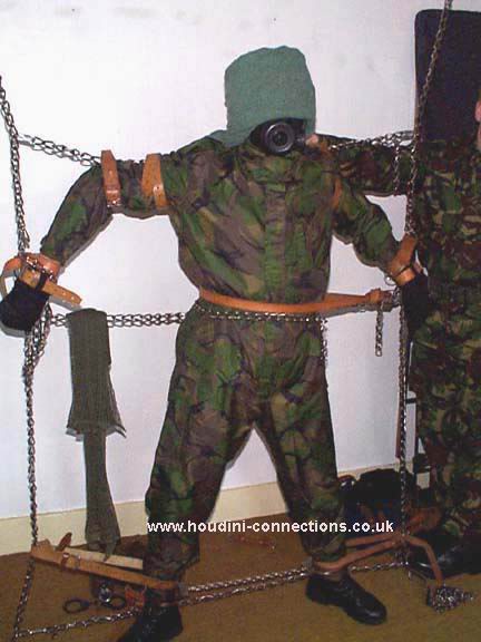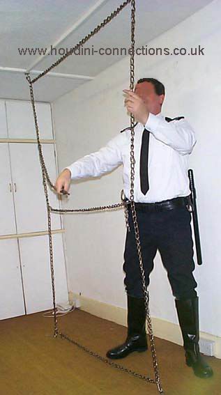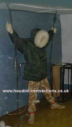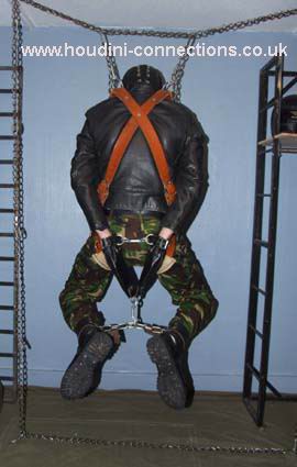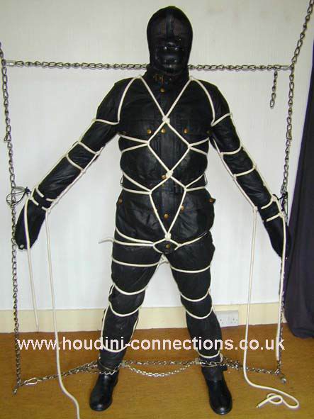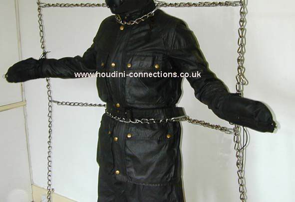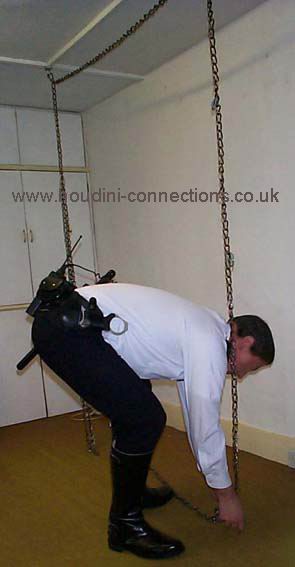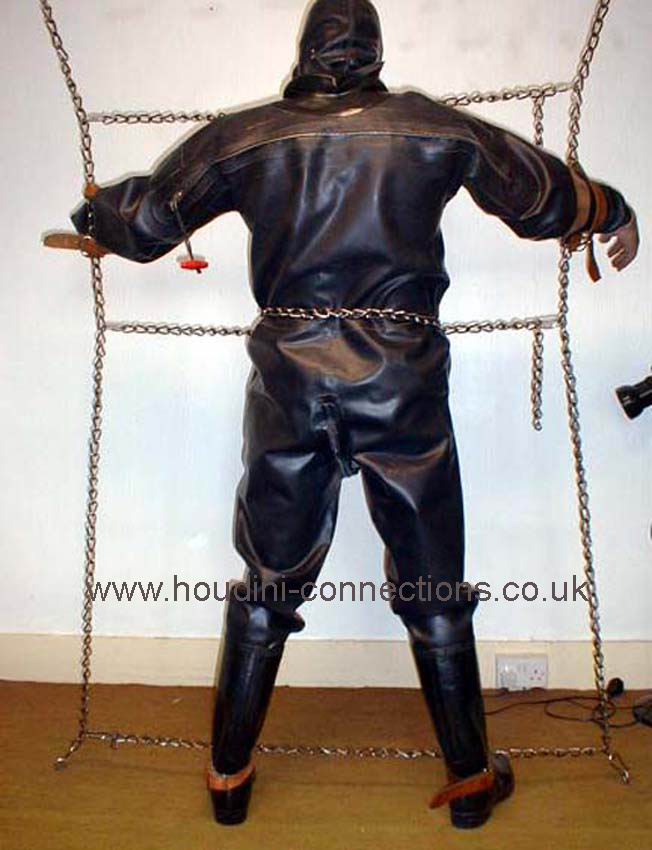 Extra chain lengths circle neck and waist. Boots well anchored to the chain parallel with the floor. Each wrist firmly tethered out to upright chains. |