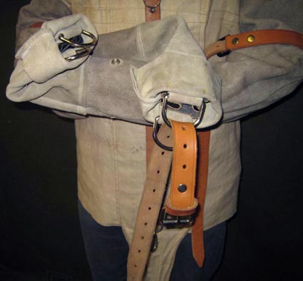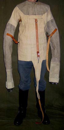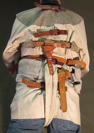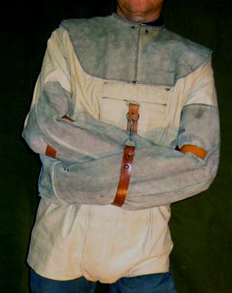 This formidable jacket is the result of years of discussing and experimenting. It was made for a TV programme as the ultimate 'Escape-proof' strait-jacket challenge - and nobody has yet escaped from it - but not for want of trying. As one of the earliest examples of my work, it is quite crudely hand-made but is as robust as ever. Double canvas sail-cloth and tough rough-dressed leather not only give it durability, but make it look (and feel) like the heavy-duty restraint it is. |