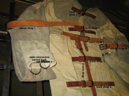 Double 'D' rings at each sleeve-end require a separate strap to close and link them together - a process which suggests a chance of escape - but because sleeves are extra long - once closed and tightened, this strap can not (usually) be re-opened without outside assistance. Many people have tried to prove that the sleeves being open-ended reduces the efficiency of the jacket - but so far the jacket remains espcape-proof. Since it was first made nearly thirty years ago this jacket has sucessfully provide the ultimate challenge - but there's always somebody eager to 'have a go' . |