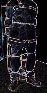 Robert continued to squeeze the now rampant cock “ ... and you tied down and gagged ... and totally helpless ...” The whole immobilised body was suddenly convulsing within the confines of the suit and plastic ties. Muffled cries escaped although trapped under the experienced hand that remained clamped over his mouth, as Chunky struggled to thrash his head from side to side. His body arched and bucked, rattling the ladder and the supporting metal cage - which, fortunately was well anchored to the floor ... as a CCTV camera zoomed silently in to record the event.