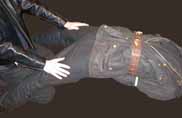 “Keep quiet!” he ordered as I felt something tighten between my elbows. It m “No, please ....” “In” he insisted and I felt my leg lifted and my torso fell sideways and my second leg was raised and twisted and soon I was crammed into the cramped space. My head still inside the green Barbour jacket, I was facing away from the opening, so I could see nothing and only hear his parting shot. “Oi really lyke yer suit - suits, bouy – you should have let me fuck you when it was offered – but thanks for the camera and phone. Guess when it gets to closing time somebody’ll come and check out the cars that haven’t left yet. With that the lid slammed shut and everything went even darker. The next sound was the car door being slammed. Was he going to drive off with me in the boot – to where? But then, even more scary, I heard his bike fire up and rev. Was he deliberately letting me know he was leaving? If there had been any room to panic I might have panicked – but wedged as I was I could only concentrate on breathing in this confined space under the tangle of rich-smelling fabric. I’d often wondered what it might feel like to be locked in the boot of a car. I’d read about it in one-handed reading – but there was nothing sexy about this harsh reality – and my bladder was now full to bursting. I decided to try reversing my position. I shook and dragged at the head-covering until I felt it move aside slightly. Chinks of light gave me as sense of orientation, so I decided to try and move so I’d be facing the opening if/when the boot was next opened. How long would the air last? Were there dangerous petrol fumes. The smell of the wellies distracted me as I squirmed – but the predominant smell was of waxed cotton. My encased body in this confined space was generating heat (only my feet were cold). I bumped my head and banged my knee trying to reverse my position. My wrists didn’t budge in their binding, my elbows weren’t cinched dangerously tight, but no amount of writhing was going to shift the plastic bands. Trying to lay my head down was painfully uncomfortable. This was not a horny trip – but somehow ... My mind seemed to switch off ... except for the pain of my bladder. Was I going to piss myself? ***** In the past I’ve spent a lot of time enjoying/surviving tied-up situations. It’s been my passion for as long as I can remember. And since adulthood I’ve been lucky enough to engineer myself into many situations that turned me on. This wasn’t one of them. Although writing about it now is giving me a hard-on – at the time I was seriously worried. I knew there was no point in wasting energy and precious oxygen shouting. Best stay quiet and listen for any sounds of people – then start yelling. As I waited I speculated on what might happen when/if I was discovered. Straight forward enough – menaced by a local skinhead as I returned to my car – the camera and phone stolen ... I thought of Mike waiting for me to arrive. Might he come looking for me – specially if he phoned and the phone wasn’t answered ... what then? ... Jesus I needed to piss. In the past I’d been left tied and suffered the painful build-up before eventually being forced to piss myself; something we’re conditioned to resist – but once you reach a certain point and you can’t hold out any longer ... you wonder why you put up so much resistance (and endured the pain). Piss & get it over with. I thought the stream would never end, and felt the warm spread around my groin and stomach and thighs ... but all too soon the heat went out of it and I was cold and damp and miserable – but somehow not afraid. I’d survived some seriously uncomfortable ‘scenarios’. The main store probably would close around eight and I’d no idea what time it was now – three – four? I pictured the crop-headed Cornishman exploring the camera and finding the pictures I’d taken. He was turned on by waxed cotton – so was I. Was the motorcycle cop who’d stopped me also into it? He’d said “As a matter of fact, sir, I can appreciate that.” Strange that I remembered his exact words, lying scrunched up in the pungent darkness. Perhaps I’m not as strange with my kink as I sometimes think. My thoughts drifted on to visualise my wardrobe hung with different suits, one and two piece waxed – Black Prince and Rukkas, padded and unlined ... and the stack of sticking together old naval foul weather suits stored in a crate: rich-smelling with their own unique scent when hauled out for an occasional deliberately hot and sweaty layering session. I thought of Mike’s even more varied collection, which included a couple of seriously professional diver’s dry suits; the sort of suit you can’t escape from once you’re in it. That’s something I knew from long and uncomfortable experience – but I still got off on the memory of the experience. Some experiences are like that, I mused in the claustrophobic darkness. I remembered the sessions in smooth tight-fitting neoprene wet suits. Being Working around Mike’s place had included a lot of fetching and carrying. Stones to re-build stone walls in the pissing rain – suitably suited-up – wet inside and outside the layering. Chained by the ankle in the pig-sty, left to shovel mud – or heavily manacled, with collar, waist and boots linked together by clanking chain while digging over his potato patch. Some of my longer ‘vacations’ at Mike’s had been harder work than my everyday office job. I’d got home to My mind drifted back to the heavily-waxed bag hood Mike had had made for me - and mitts made from the same rich fabric that laced onto your wrists so you couldn’t get them off or use your fingers, specially if thickly padded bike gloves were taped on first. Then there was the old thickly padded Trialmaster Belstaff bike jacket that he’d had mitts sewn to under the cuffs. Outwardly it looked like a normal jacket in public ... bu